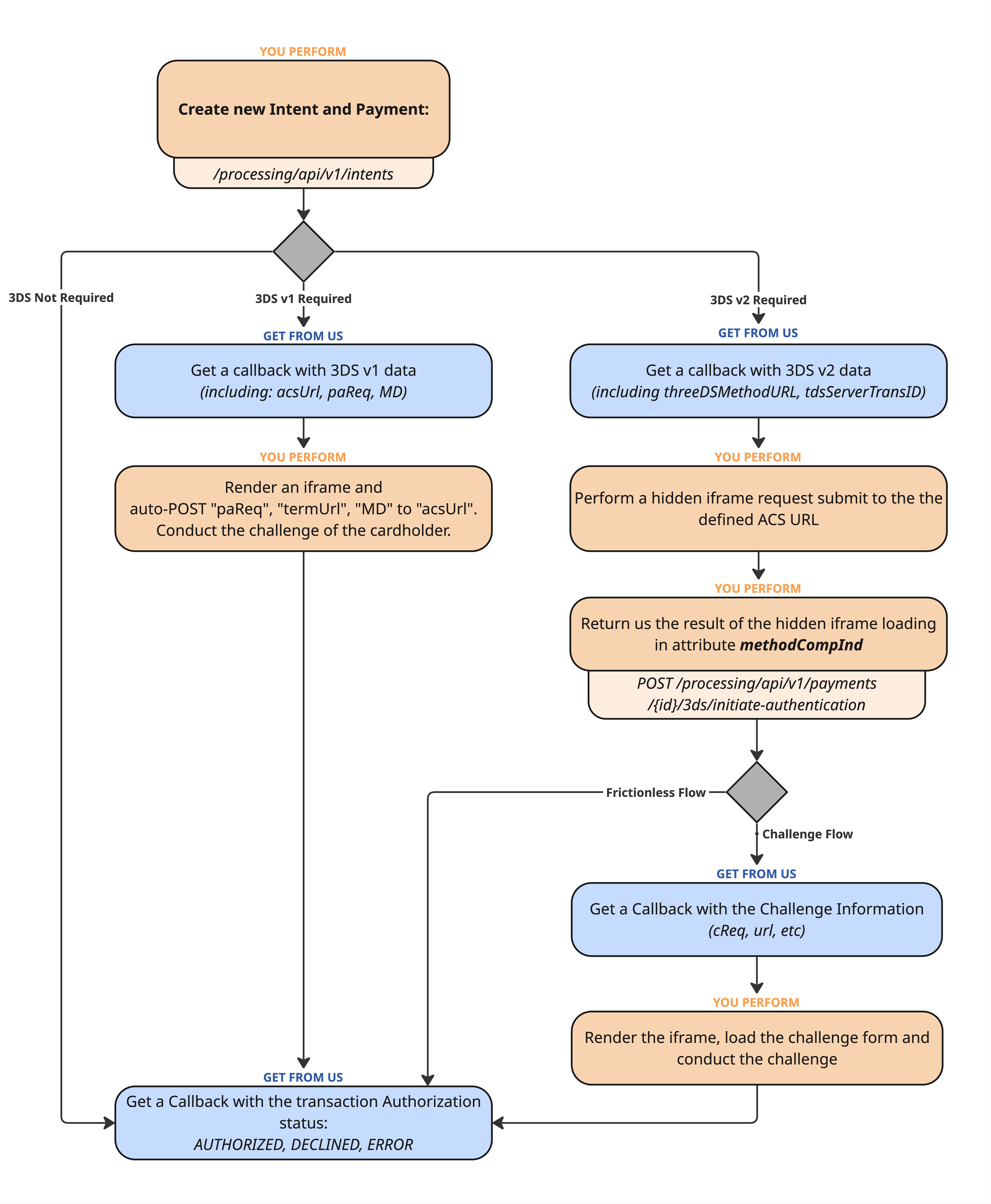 - Once received, we will complete the 3DS verification and send you a webhook with the final transaction status - either AUTHORIZED or DECLINED.