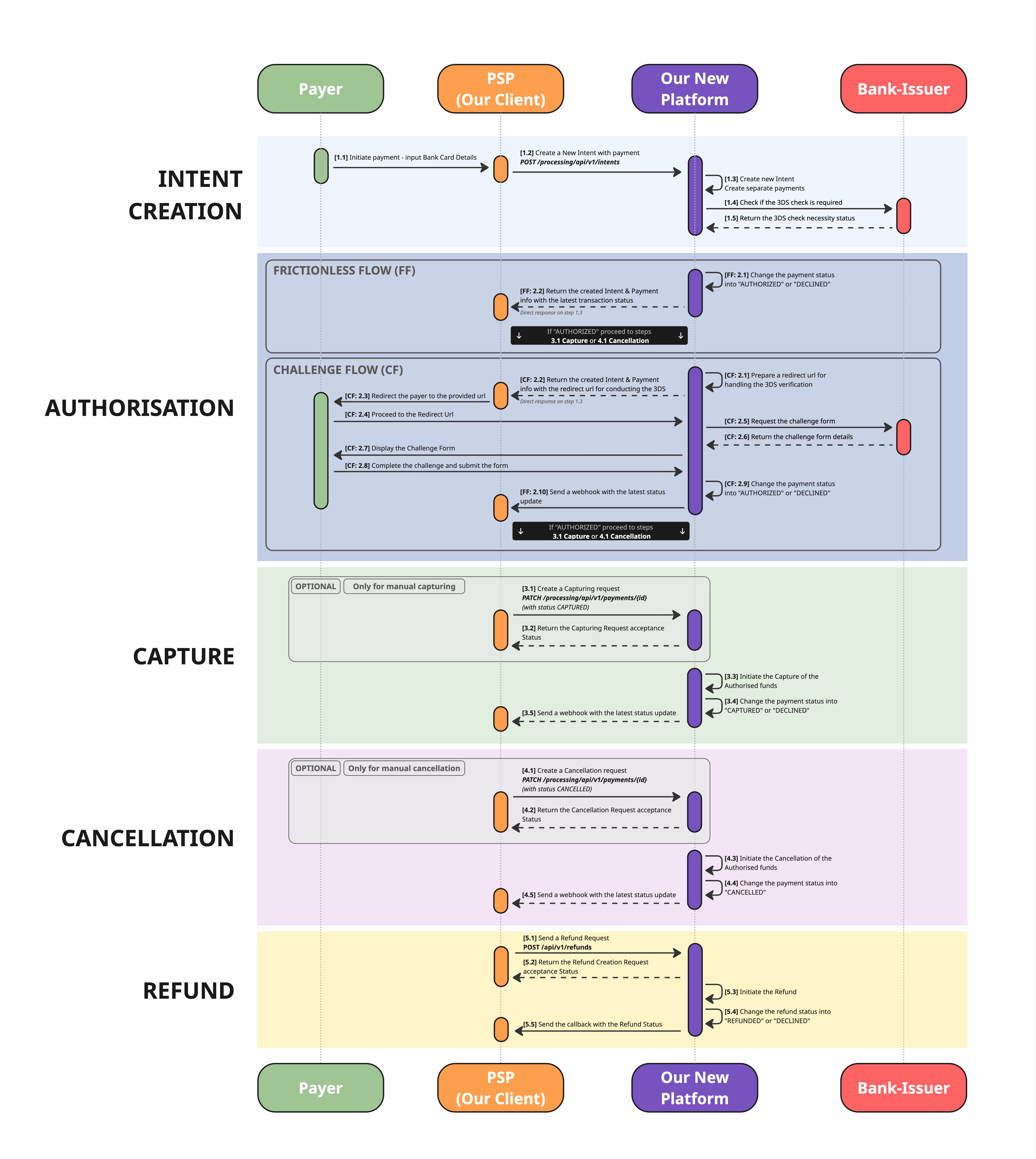 | Create Intent | POST /processing/api/v1/intents | Creates a new Intent with one or more Payment transactions. The platform validates the request, creates internal payment records, and checks whether 3DS authentication is required. |